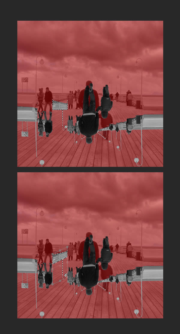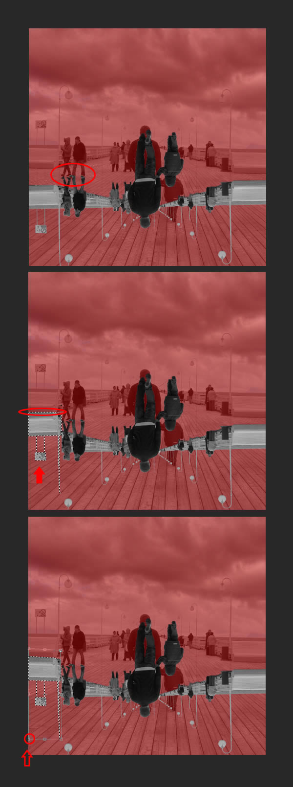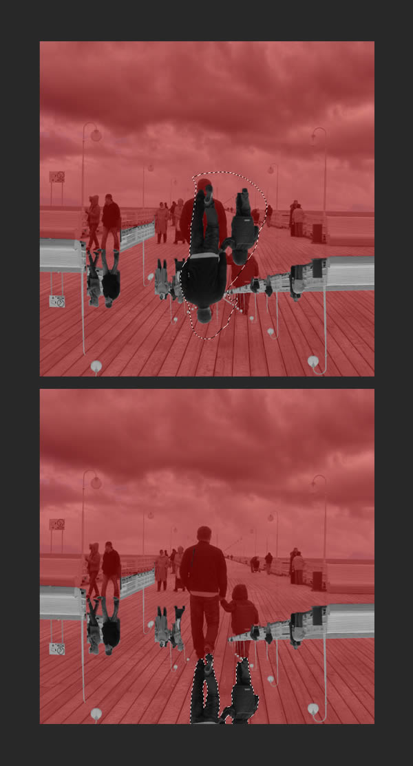 با استفاده از ابزار کمند (Lasso) با فشردن L، مرد و بچهی وسط عکس را انتخاب کنید و آن را به پایین حرکت دهید تا پاهای تصویر انعکاسی با پاهای تصویر اصلی هماهنگ شود.