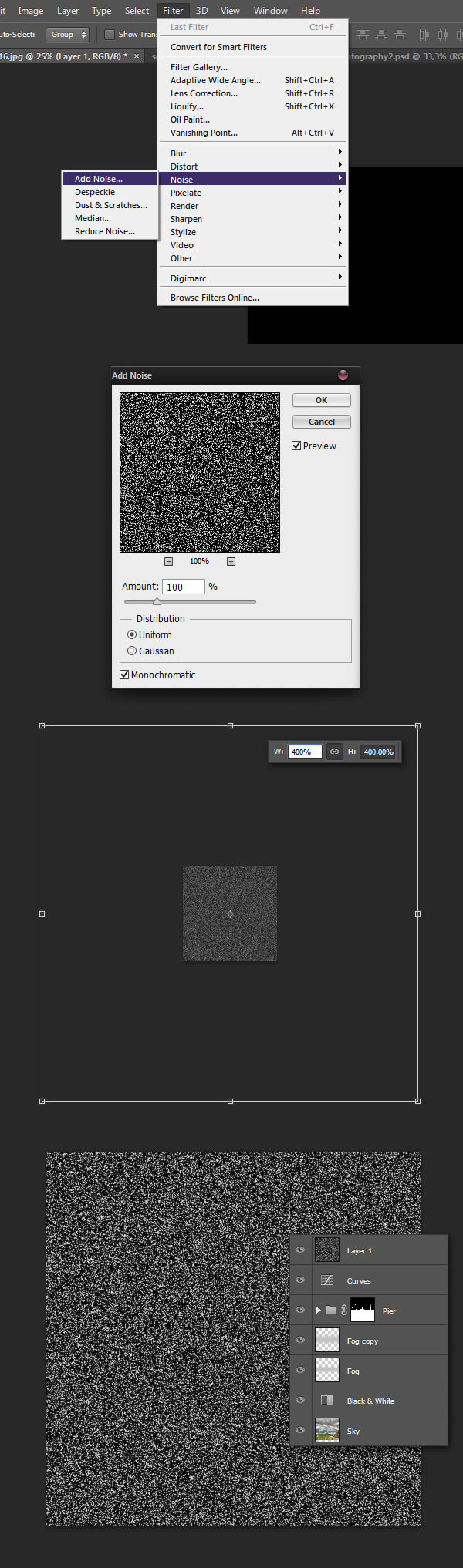 راه متداول برای ایجاد باران ترکیب فیلترهای Add Noise و Motion Blur است. ابتدا یک لایه ی جدید ایجاد کنید (ctrl+shift+N). سپس آن را سیاه کنید (D سپس Alt+Backspace). سپس از طریق Filter>Noise>Add Noise یک نویز ایجادکنید و اندازه ی آن را %400 بگذارید.