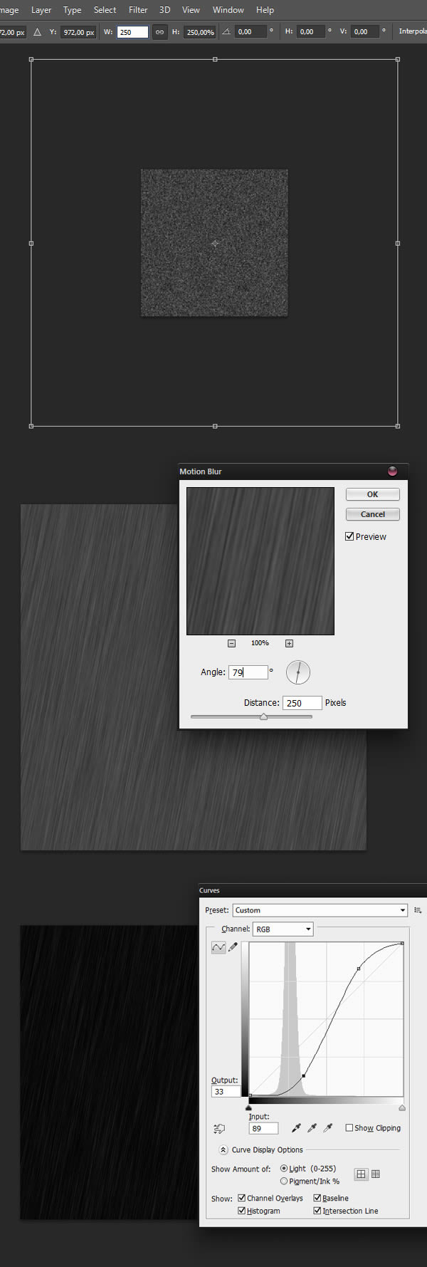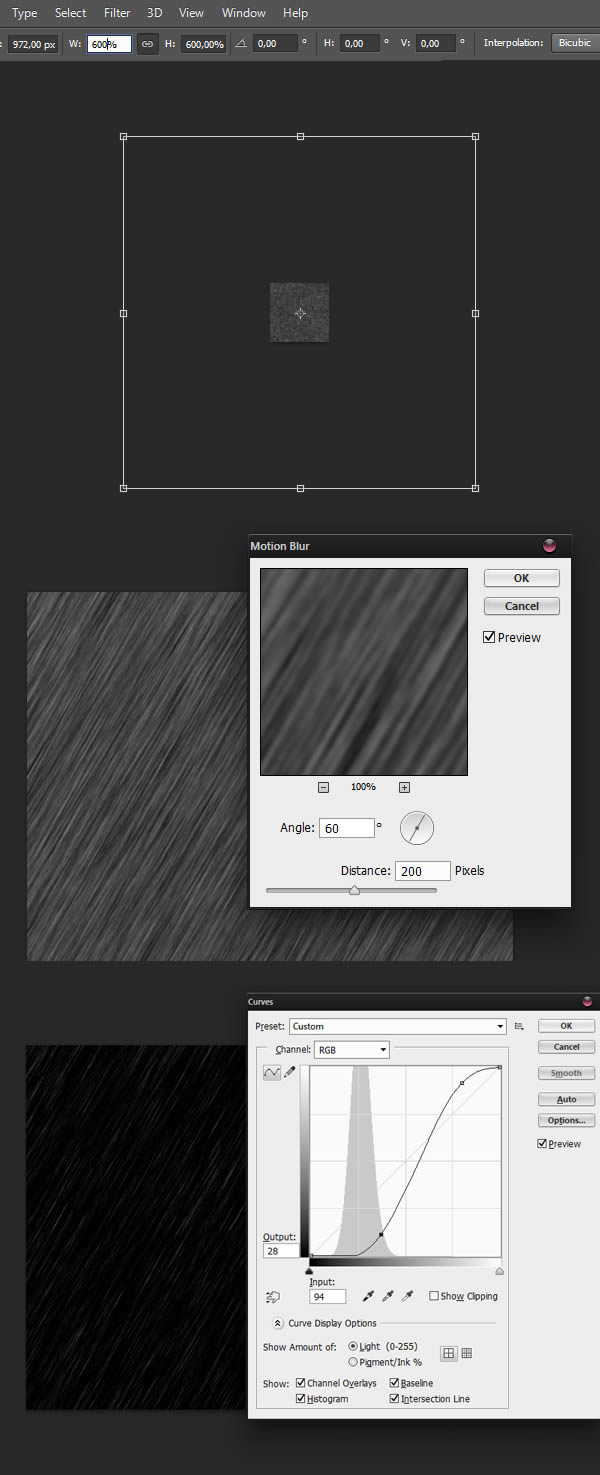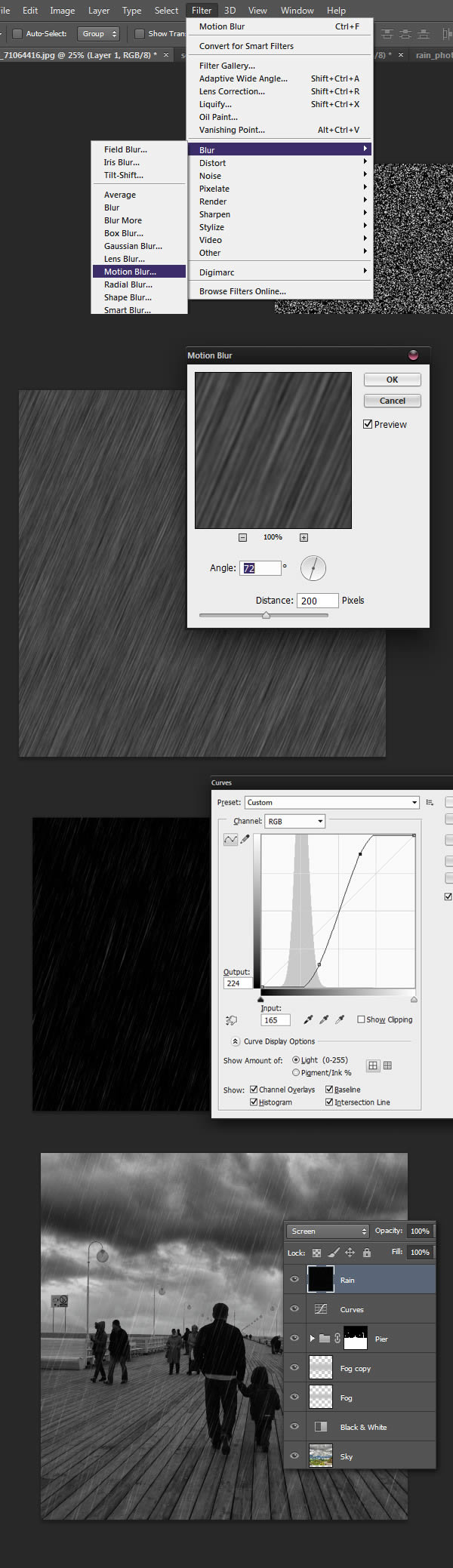 نکتهای که باعث میشود تصویر واقعیتر و جالبتر به نظر برسد اتفاقی بودن است. به خاطر وزش باد، باران در خطوط مستقیم مشخصی فرود نمیآید. برای ایجاد این اتفاقی بودن، باید فرآیند آخر را چندین بار با زوایای مختلف و اندازه های مختلف تکرار کنیم. در این مورد من نویز را با اندازهی %250 و بلور را زوایه ی 79 درجه اجرا کردم.