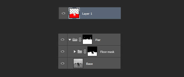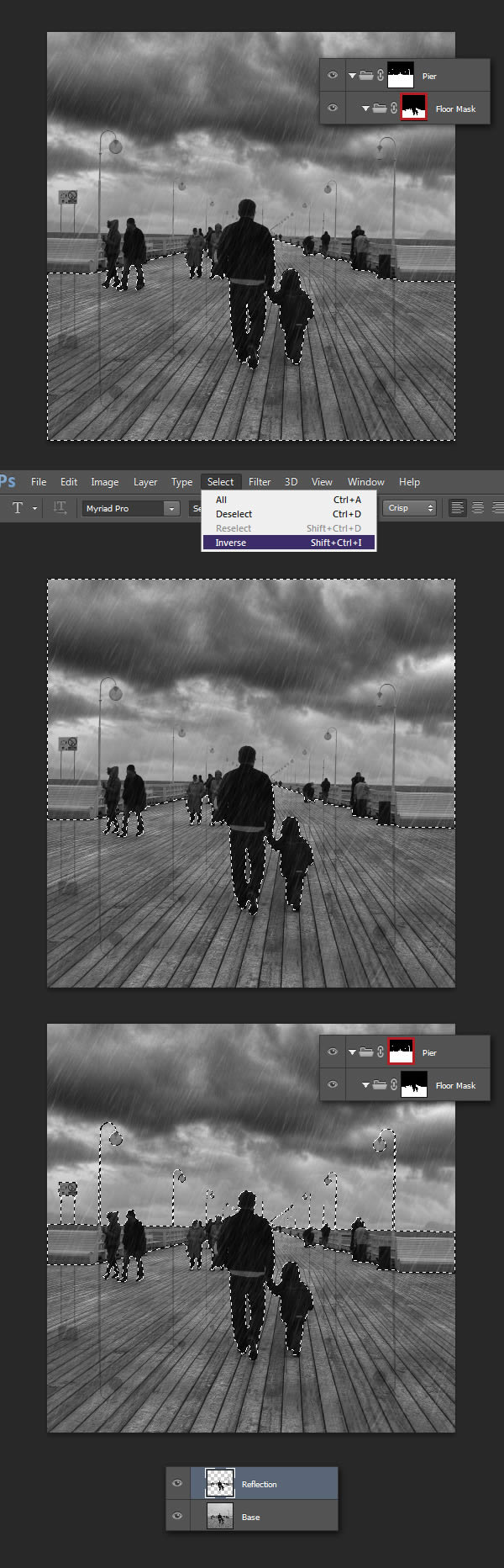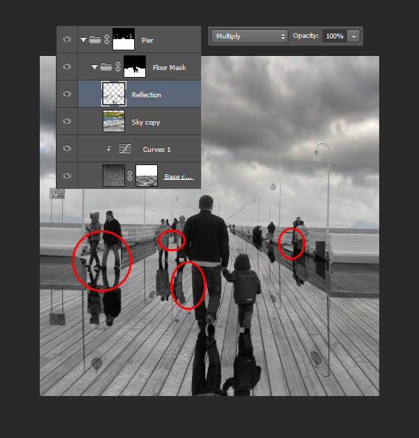 الان نیازمند این هستیم که ناحیه ی بین زمین و آسمان را انتخاب کنیم. این کار را با استفاده از ctrl+click بر روی ماسک گروه Floor mask انجام می دهیم. حالا ماسک را معک.س می کنیم (select>inverse) و ctrl+alt+click را روی ماسک گروه Pier اعمل می کنیم. در حالی که در حالت انتخاب هستید، با فشردن ctrl+J ناحیه ی انتخابی از لایه ی Base را در یک لایه ی جدید کپی کنید. لایه ی جدید را Reflection بنامید.