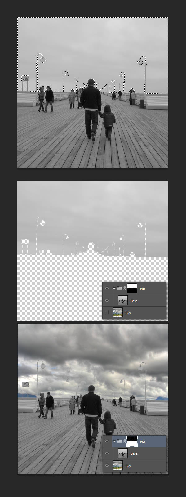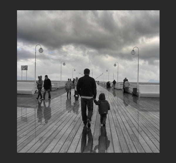 تصویر Walk on pier را در فتوشاپ باز کنید، لایه را base نام گذاری کنید و آن را قفل کنید.