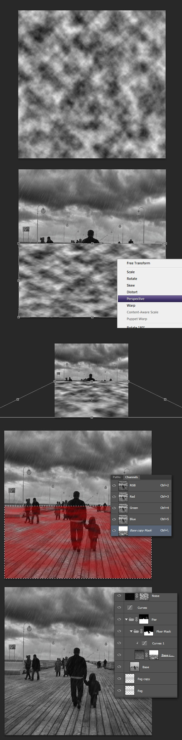 یک بار دیگر به یک لایه یک cloudy mask می دهیم تا اتفاقی بودن را بیشتر کنیم. بیایید یک لایه جدید ایجاد کنیم که از طریق Filter>Render>Clouds از ابرها پر شده. با فشردن ctrl+T این لایه را تا زیر خط افق کوچک کنید. در همان حالت Free transform کلیک راست کنید و perspective را انتخاب کنید. گوشه های پایین این لایه را بکشید تا همانند پرسپکتیو تخته ها شود. حال ctrl+A را بفشارید تا همه چیز انتخاب شود و حال ctrl+X بفشارید تا آن را cut کنید. به لایه ای که در آخرین قدم ایجاد کرده اید که ماسک بدهید. ماسک را در پنل channel انتخاب کنید و ابرهایی را که cut کرده اید را در ان paste کنید.