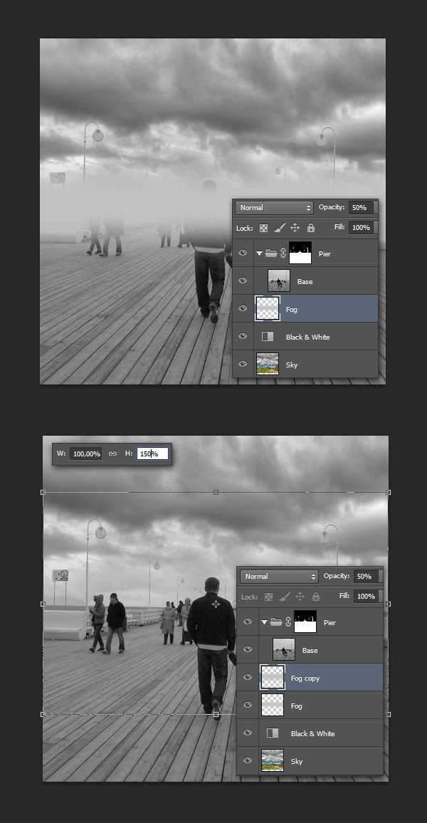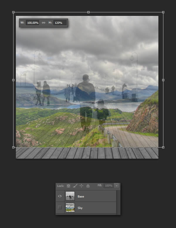قدم اول برای ایجاد باران، داشتن ابرهای مناسب است. از طریق File>Place تصویر Cloudy Scotland را اضافه کنید. باید مقداری این عکس را بکشید تا ابرها کاملاً آسمان را بپوشانند. برای این کار ctrl+T را بفشارید و ارتفاع را %120 تنظیم کنید.برای تایید، Enter را بفشارید، لایه را sky نامگذاری کنید و آن را زیر لایهی base قرار دهید.