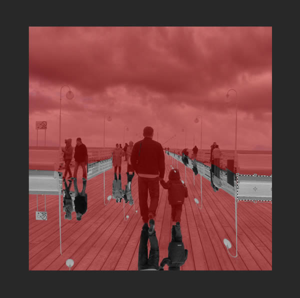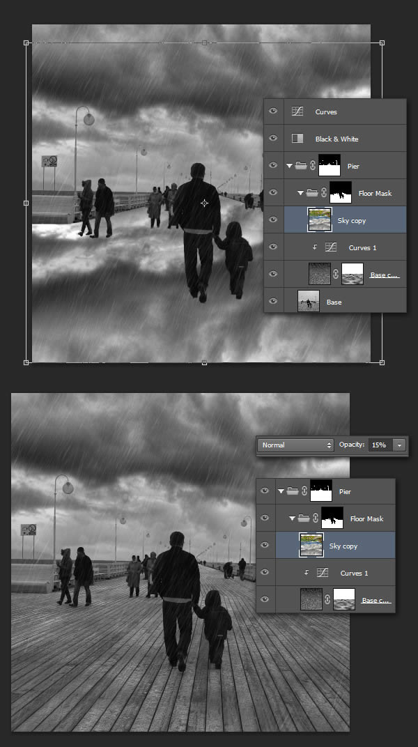 از آنجایی که کف زمین خیس است، اشیایی که روی آن هستند باید بازتاب داشته باشند، از جمله آسمان. برای این کار، لایه ی sky را کپی کنید و در پوشه ی Floor Mask اضافه کنید. سپس آنرا عمودی معکوس کنید(ctrl+T سپس کلیک راست، سپس Flip Vertical). و opacity آن را روی 15 کنید. توجه داشته باشید که در این مرحله، من فیلتر سیاه و سفیدی که قبلاً داشتیم را به بالای گروه Pier انتقال دادم.