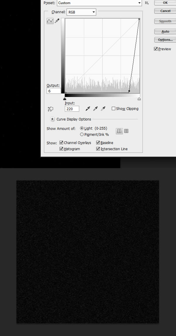 سپس به Filter>Blur>Motion Blur بروید و یک Motion Blur مورب به نویز بدهید. ctrl+M را بفشارید و پنجره curve را باز کنید و کنتراست لایه را افزایش دهید. حالت لایه ی خود را به screen تغییر داده، آن را Rain بنامید.
