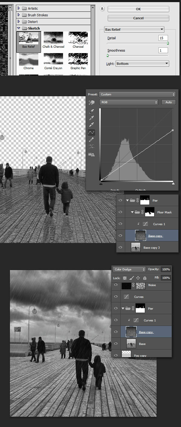لایه ی Base را کپی کنید و آن را در گروه Floor Mask قرار دهید. به Filter>Filter Gallery بروید و Bas Relief را انتخاب کنید. مقادیری که در تصویر زیر آمده را وارد کنید و Enter را بزنید. با Curves مقداری آن را تیره کنید. با نگه داشتن Alt کلیک بین دو لایه می توانید این لایه Curves را فقط به یک لایه تخصیص دهید. حالت لایه را به color dodge تغییر دهید.