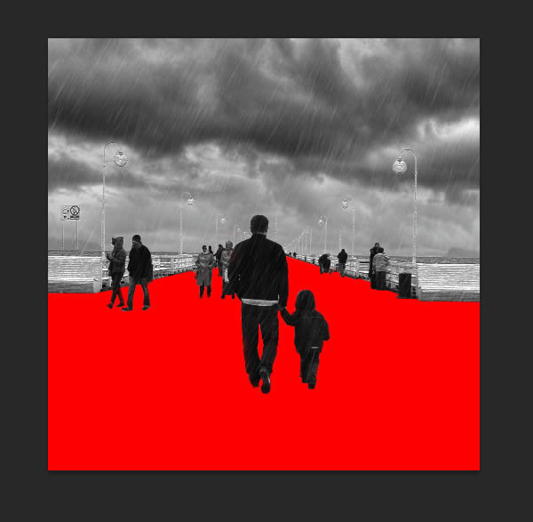 ما تلاش کردیم تا بتوانیم باران را ایجاد کنیم ولی تصویر ما هنوز خیلی واقعی به نظر نمی رسد. چرا؟ خب وقتی به تصاویر بارانی نگاه می کنید، میبینید که قطرات باران به سختی دیده میشوند. چیزی که دیده میشود، یک زمین تیرهتر، خیسخورده و بازتابدهنده است. این قسمت مهمترین و سختترین قسمت فرآیند است. در مرحلهی اول باید قسمت کف تصویر را ایزوله کنیم. برای این کار با هر ابزاری که دوست دارید کف را انتخاب کنید و در یک لایهی جدید قسمت انتخاب شده را با یک رنگ بپوشانید.