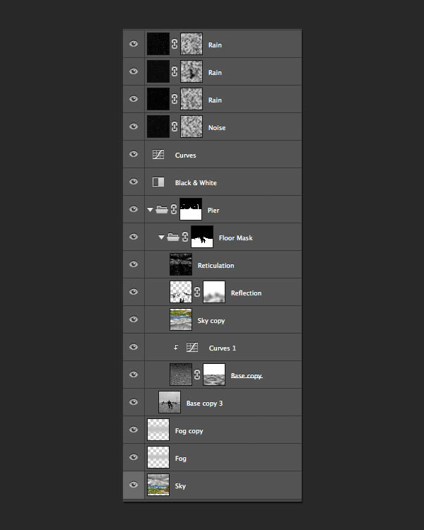 در هنگام بارش باران، رطوبت هوا بالاست که منجر به ایجاد مه می شود و عناصر دوردست دیده نمی شوند. برای این کار از یک براش نرم بزرگ با رنگ خاکستری (در این مثال C3C3C3#) استفاده کنید و با نگه داشتن Shift یک خط مستقیم روی افق بکشید. سپس تاری(opacity) لایه را روی %50 تنظیم کنید. بعد از آن می توانید این لایه را با فشردن ctrl+J لایه را تکثیر کنید و برای داشتن یک مه نرم تر، این لایه را در جهت عمودی بکشید. هر دولایه را fog بنامید و آنها را زیر گروهی که قبلاً ساخته اید قرار دهید.