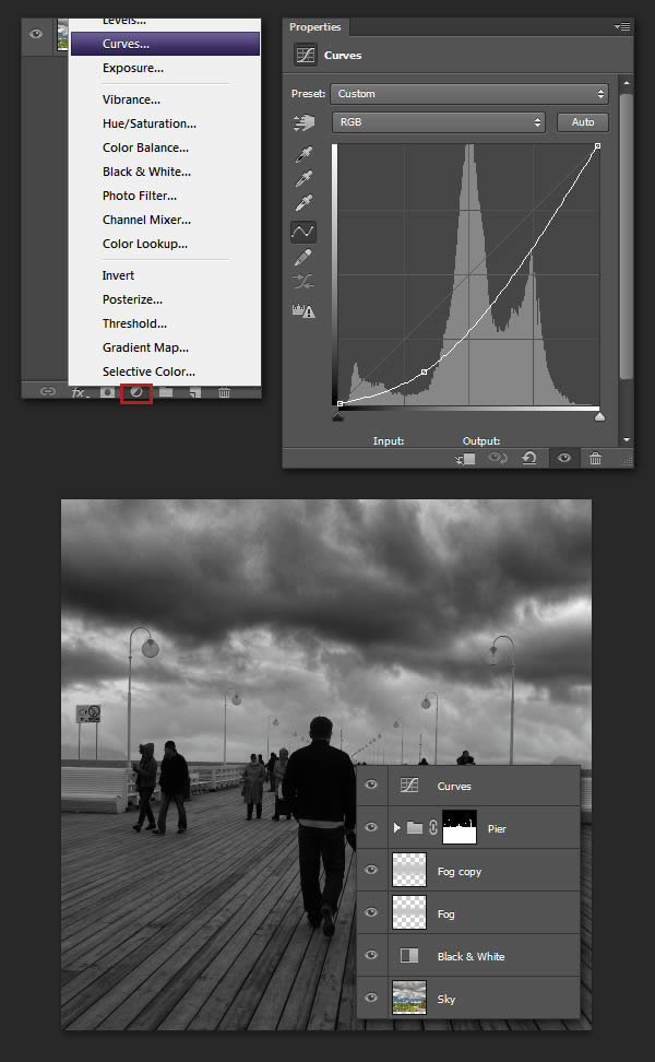 در نهایت یک لایهی منحنی (curve) تنظیم کننده ایجاد کنید تا عکس را تیرهتر کنید و این لایه را بالای همهی لایهها قرار دهید.