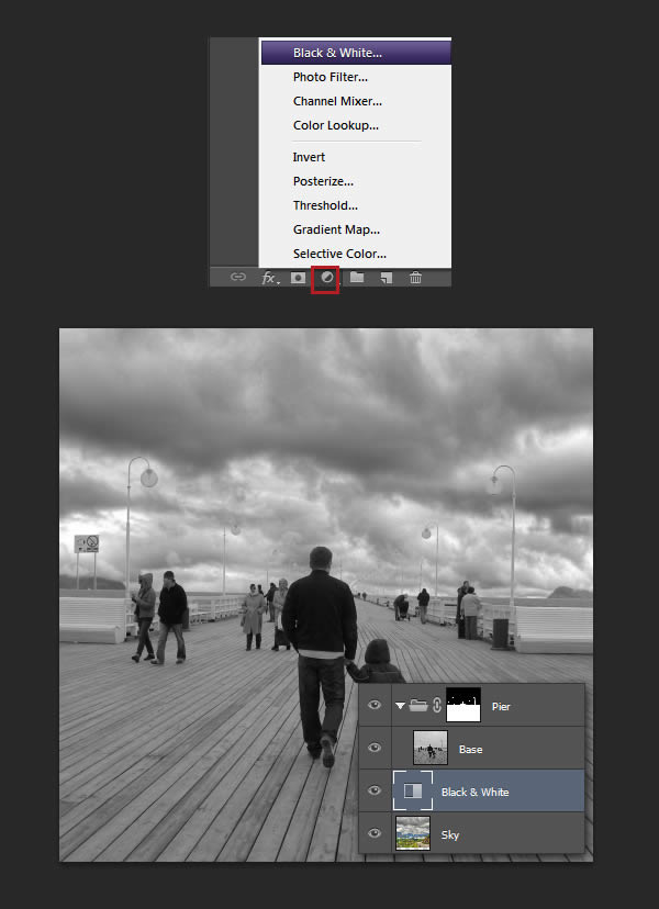 از آنجایی که آسمان هنوز مقداری رنگ دارد، یک لایه ی ساه و سفید کننده ایجاد کنید تا مطمئن شوید که کاملا با لایهی Base تطابق دارد.