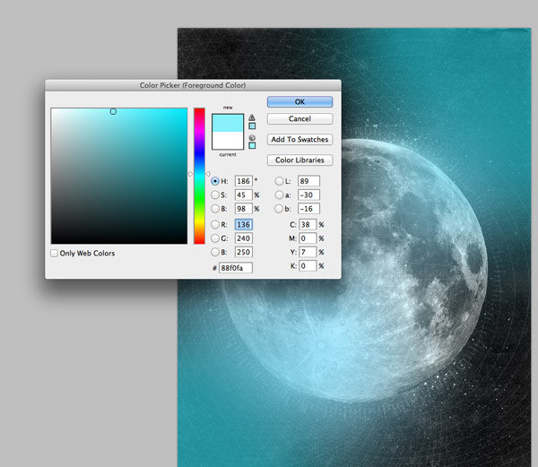 یک لایه جدید بسازید سپس از تعدادی قلموهای اسپری نقاشی spray paint brushes برای اضافه کردن شکل های چکیده شده اطراف ناحیه ماه استفاده کنید. سعی کنید اسپری های خوبی آن سوی کناره های ماه اضافه کنید اما مناطق مرکزی را از الگوی اسپری چکیده شده در امان نگه دارید.
