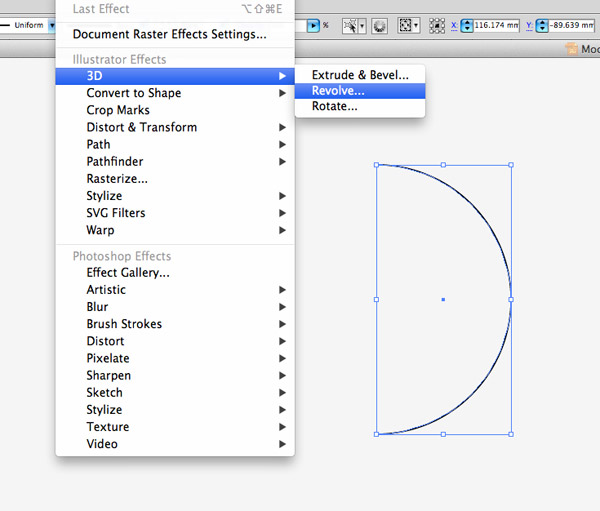 به ایلستریتور برگردید و یک دایره در صفحه بکشید. با ابزار Direct Selection نقاط سمت چپ را حذف نمایید سپس به مسیر Effect>3D> Revolve بروید.