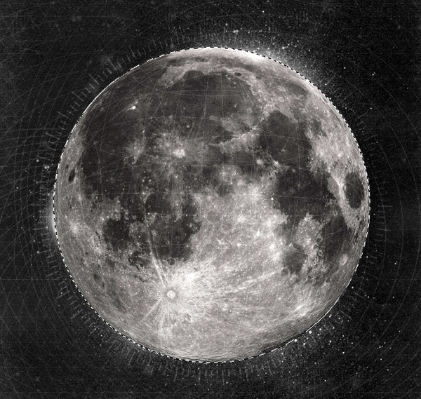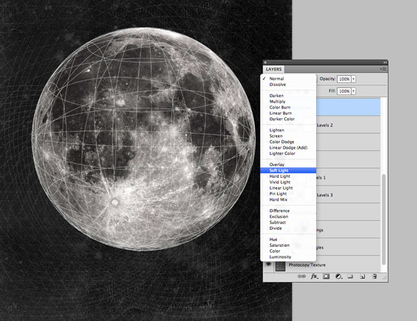 کره ی سیمی را برای قرار گرفتن درست در ماه، بزرگ یا کوچک و معکوس کنید، سپس از روی آن یک کپی بگیرید و آن را بچرخانید تا خطوط پیچیده ایجاد شود. blending mode را در حالت Soft Light قرار دهید.