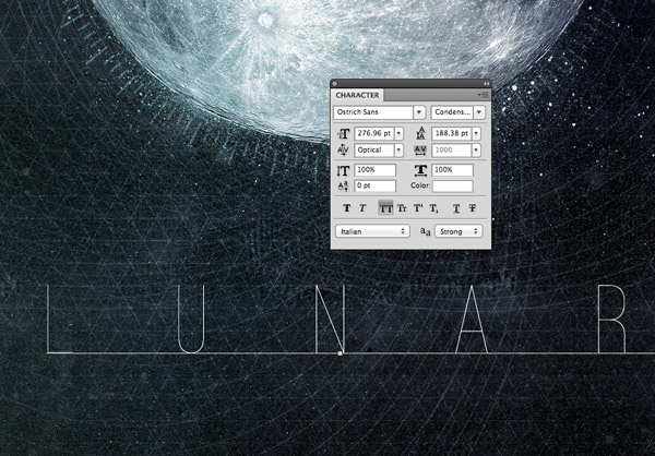 کار را با مقداری متن به پایان برسانید. ما کلمه Lunar را با یک فونت Ostrich Sans و سایز 1000pt اضافه کردیم.