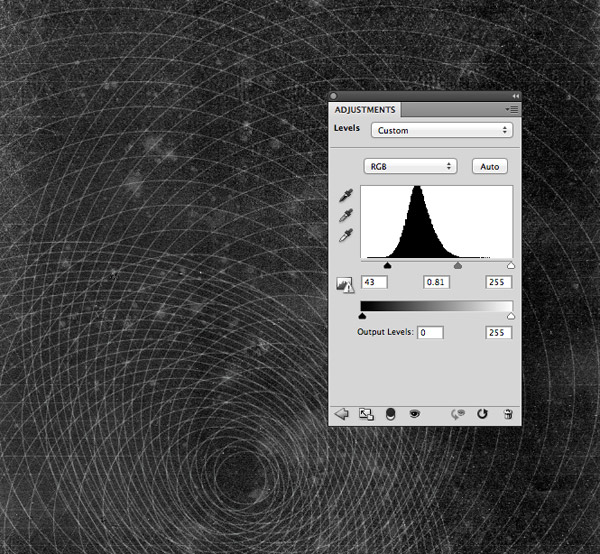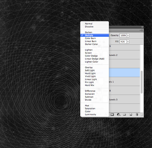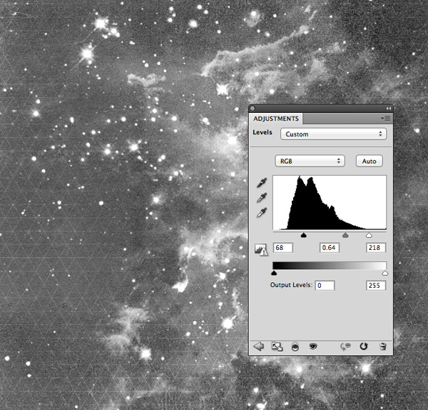 یک تصویر از تصاویر قلمرو کیهانی، مانند تصویری که ما استفاده کردیم، را دانلود نموده و در صفحه کپی نمایید. رنگ های تصویر را تنظیم نمایید، Blending mode را به Screen تغییر دهید و برای افزایش رنگ زمینه، Levels را تنظیم نمایید. به منظور اضافه کردن الگوی های دقیق بیشتر به پس زمینه، Fill را تا حدود 23 درصد کاهش دهید.
