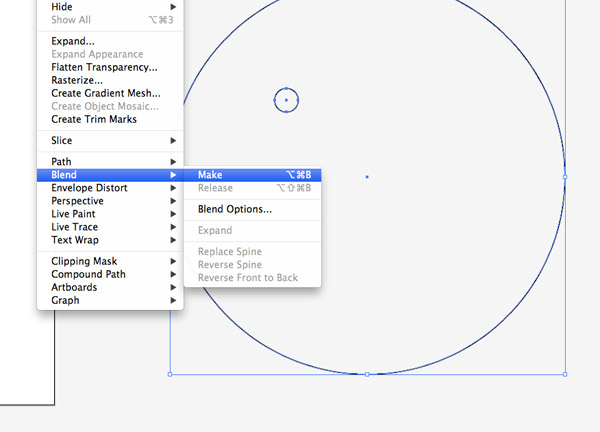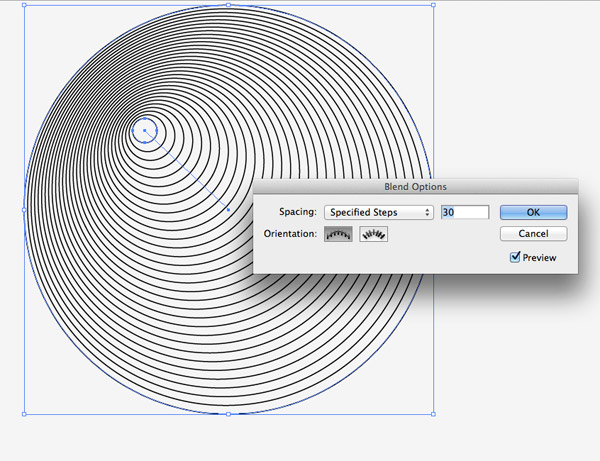 به ایلستریتور برگردید و در صفحه دو دایره بکشید، یکی کوچک و دیگری بزرگ. هر دو را انتخاب نمایید و به مسیر Object>Blend>Make بروید، سپس برگردید و Blend Option را تغییر دهید.
