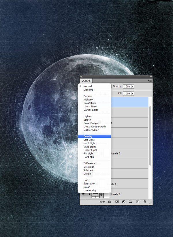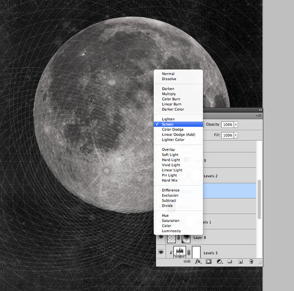 یک تصویر بزرگ از ماه را کپی نمایید و Blending mode را به Screen تغییر دهید تا نواحی مشکی را روشن و شفاف نماید.