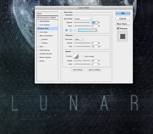 یک Layer Style ساده Outer Glow با روشنایی رنگ آبی تیره استفاده شده برای دادن ظاهری علمی – تخیلی به متن اضافه نمایید.