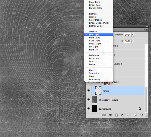 حلقه های دایره ای را برای درخشیدن در سمت راست یک سوم پایین طرح پوستر قرار دهید سپس Blending mode را به Soft Light تغییر دهید.