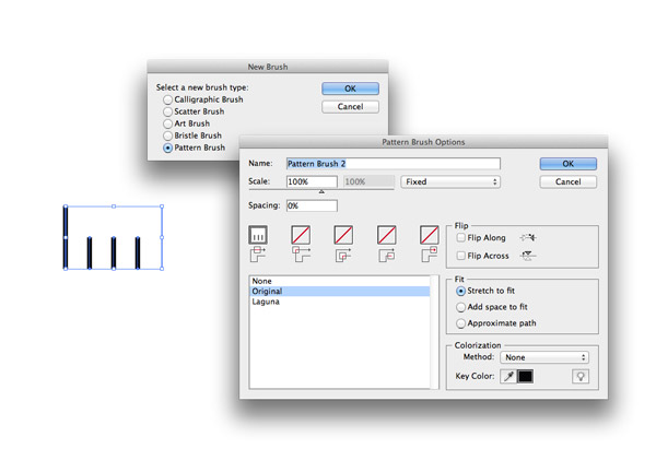 بر روی آیکون New Brush در صفحه قلموها کلیک نمایید و Pattern Brush option را انتخاب نمایید. با تنظیمات پیش فرض Ok نمایید.