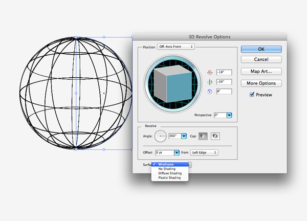 Surface option را به Wireframe تغییر دهید تا سه خط ابعادی کره ایجاد نمایید. به مسیر Object>Expand بروید تا این افکت را به یک شیء حجمی تبدیل نماید و شکل حاصل را در فوتوشاپ کپی کنید.