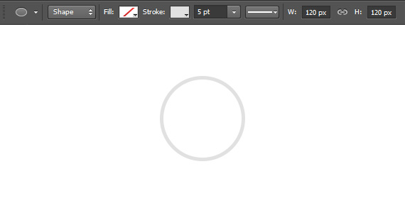 از ابزار دایره (Ellipse Tool) استفاده کنید و یک شکل 120 در 120 پیکسل ایجاد کنید و آن را در مرکز قرار دهید، لایه پر fill را پنهان کنید و یک کورس 5 پیکسلی و با رنگ #e1e1e1 انتخاب کنید.