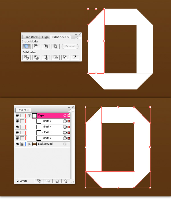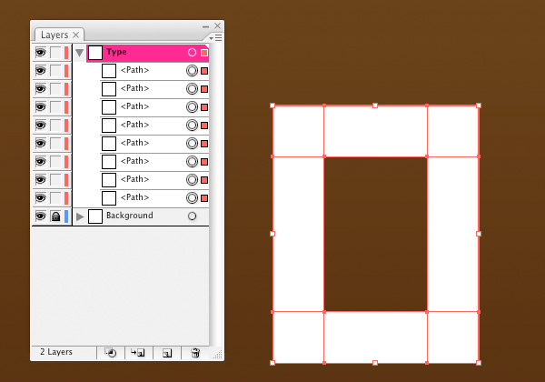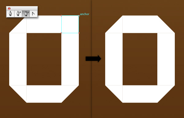 از ابزار Delete Anchor Point برای حذف کردن تمام گوشه های شیپ ها در گوشه های بیرونی تر "O"، استفاده کنید. حال شما 4 مستطیل و 4 مثلث دارید.