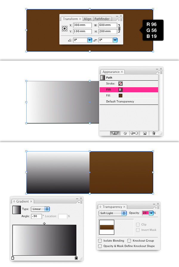 یک مستطیل با سایز مشابه را بارنگ قهوه ای به عنوان canvas رنگ کنید. برای دادن عمق بیشتر ما از gradient overly استفاده میکنیم. پنل appearance را باز کنید و از لایه قهوه را duplicate نمایید و آن را با gradient ساده سفید مشکی و جهت آن را 90- درجه عوض نمایید. Blending mode آن را softlight و opacity آن را 20% قرار دهید.