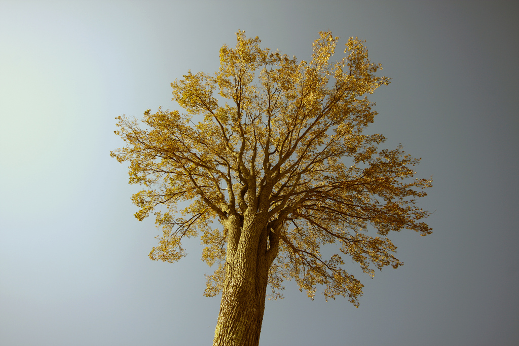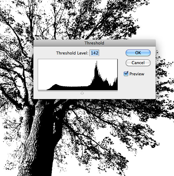 ابتدا یک فایل جدید در ابعاد 11 در 17 با دی پی آی 300 باز می کنیم. سپس تصویر تک درخت را وارد می کنیم. برای تبدیل این تصویر به یک فرم مشکی تک رنگ، با فشردن ctrl + Shift + U تصویر را سیاه و سفید می کنیم و در ادامه تنظیمات Threshold را اعمال می کنیم (Image>Adjust>Threshold). برای سیاه شدن به اندازه کافی تصویر نیاز خواهیم داشت ضریب را در قسمت تنظیمات کمی تغییر دهیم.