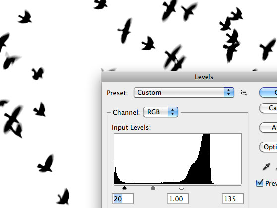 حالا می خواهیم عنصر دوم را اضافه کنیم. تصویر پرندگان را با فشردن (Cmd+Shift+u) سیاه و سفید می کنیم و در ادامه برای از بین بردن رنگ خاکستری آسمان از طریق (Image | Adjust | Levels) اقدام می کنیم.