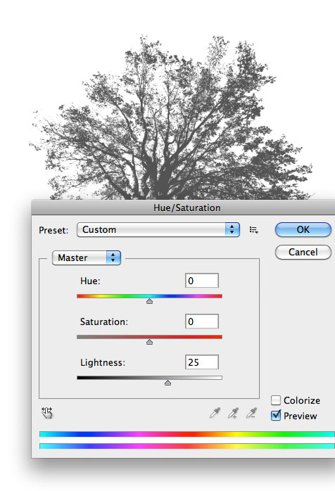 حالا به وسیله ابزار سلکت (Magic Wand Tool “w”) قسمت سیاه را انتخاب و آن را در فایل پوستر کپی و پیست می کنیم. ما قصد داریم که این درخت بیشتر خاکستری باشد تا مشکی تک رنگ، بنابراین Lightness را در (Image | Adjust| Hue/Saturation) افزایش می دهیم.