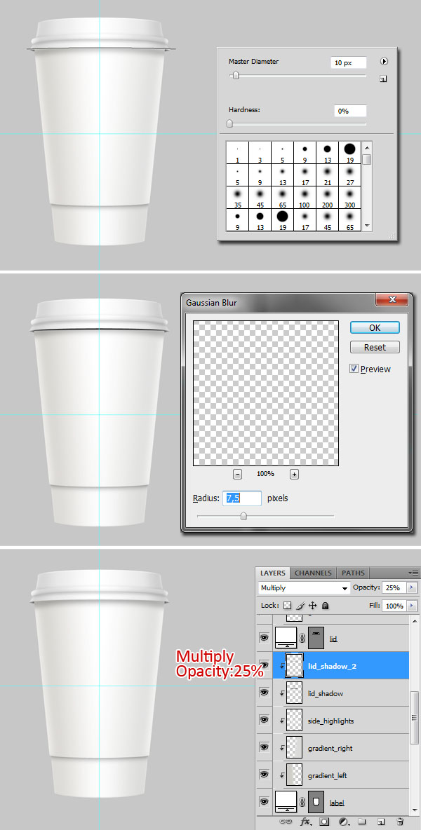 همانطور که سایه پایین فنجان را درست کردیم، سایه پایین کلاهک را درست میکنیم. نام لایه آن را lid_bottom_shadow بگذارید. در ادامه ما نیاز به ایجاد یک سایه روشن در بالا داریم. این کار را به طریق مشابه انجام دهید، اما از یک brush سفید استفاده کنید و نام آن را top_highlight بگذارید.