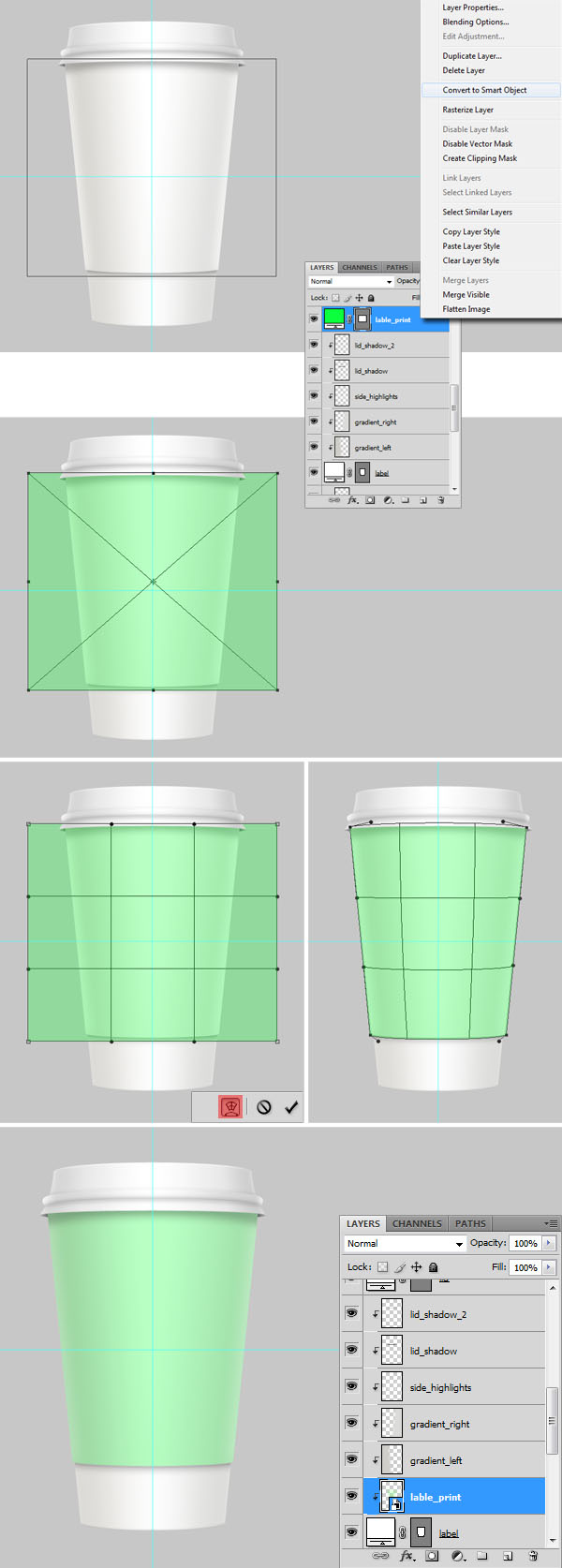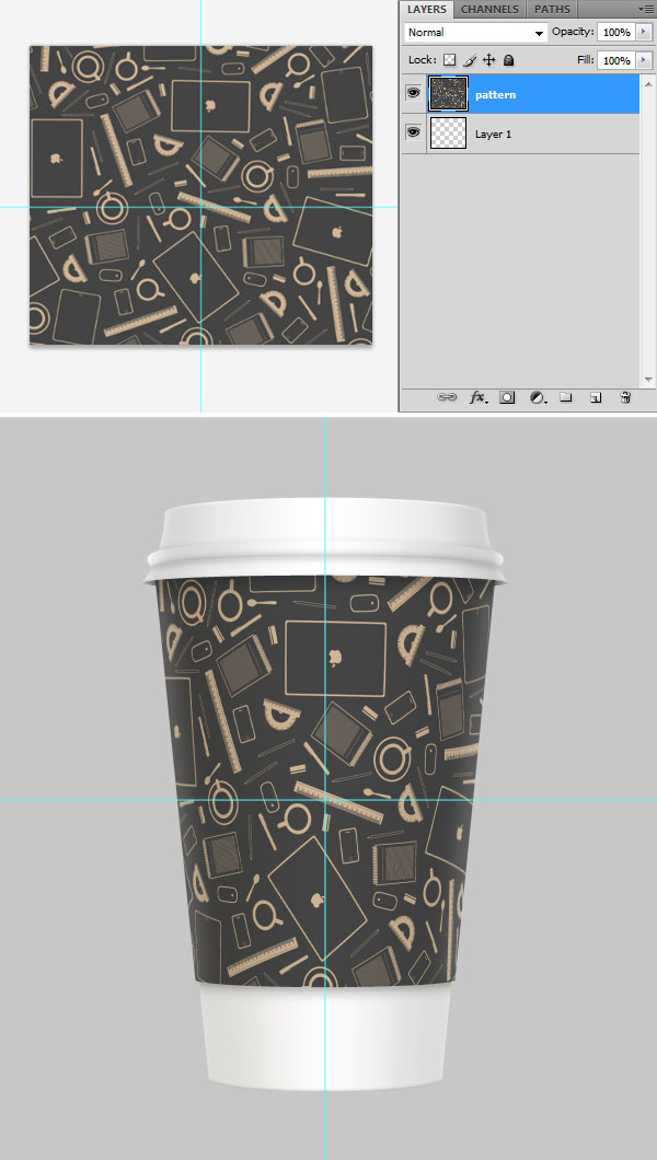بر روی لایه label_print راست کلیک کرده و Edit Content را انتخاب نموده این کار lable را در پنجره ی جدیدی می آورد. شما میتوانید لایه solid رنگ را پاک کرده و یک pattern را import نمایید. به File > Save بروید این کار smart object را update خواهد کرد. در فایل اصلی فنجان شما باید شبیه تصویر باشد.