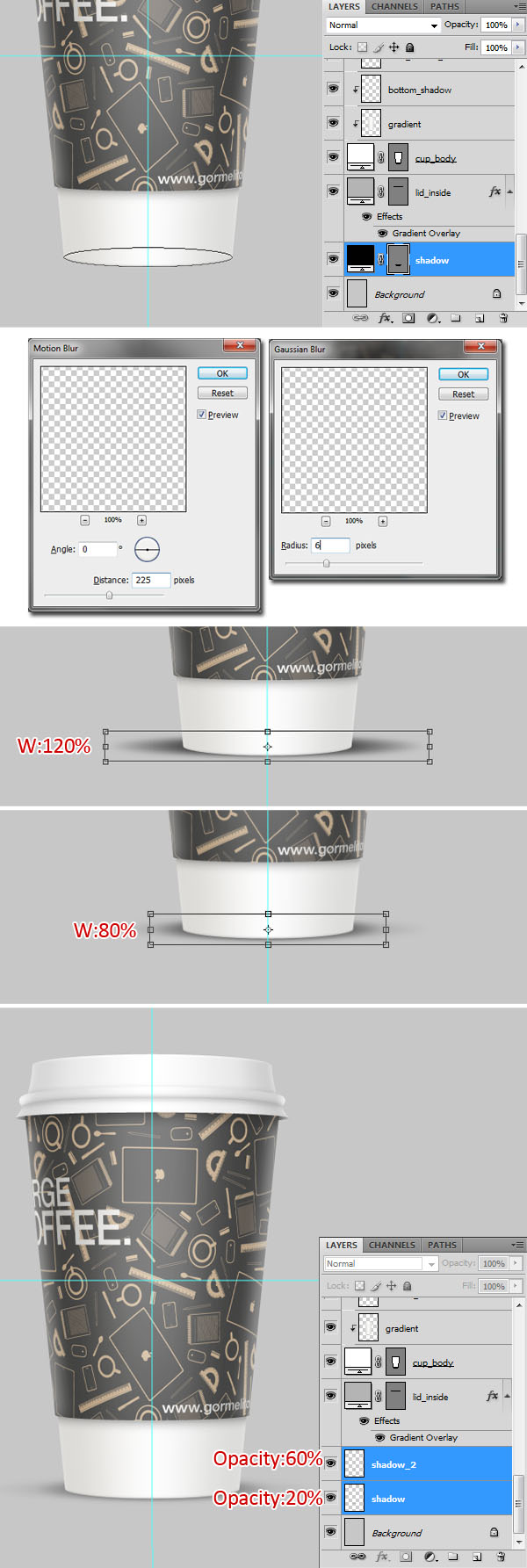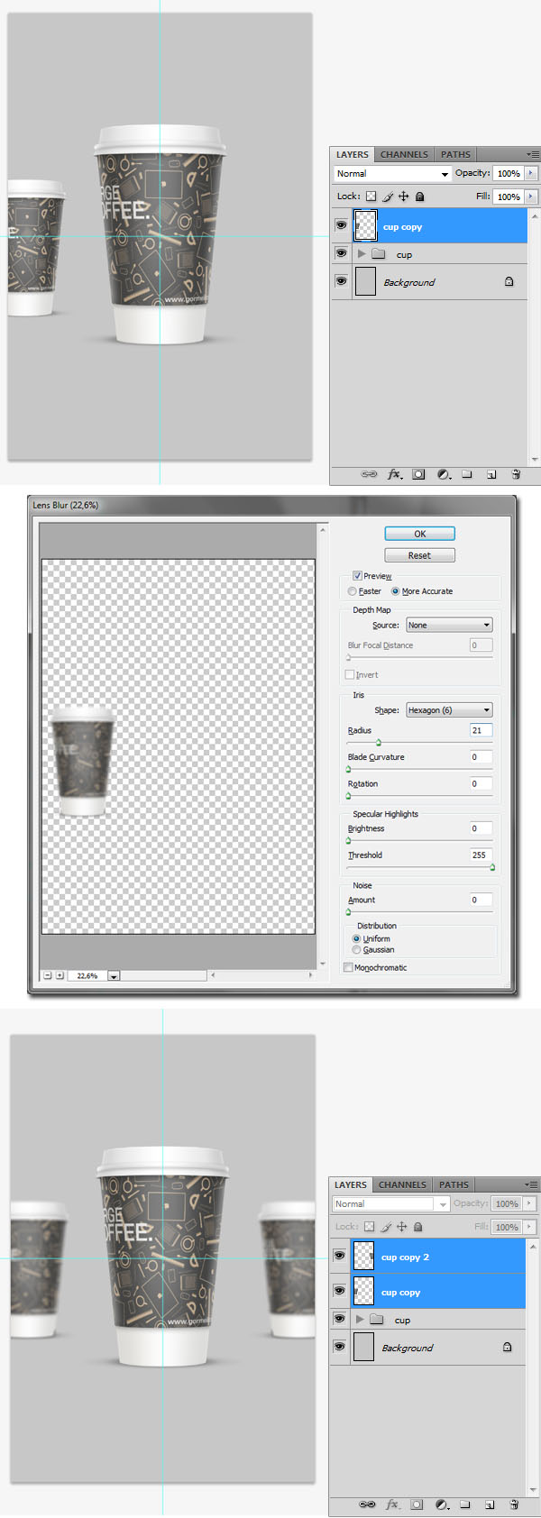 تمام لایه ها به جز لایه background را انتخاب کرده Cmd/Ctrl + G را بزنید تا آن ها را group کنید وآن group رابه نام cup تغییر دهید.از group نسخه دیگری بگیرید و Cmd/Ctrl + E را فشار دهید تا ادغام شوند. لایه جدید را Transform نمایید. Ca آن 60% میباشد که یک سایز اصلی می باشد و آن را به سمت چپ حرکت دهید برای اینکه تصویر بیشتر جالب به نظر برسد آن را به گونه ای میکنیم که انگار با فکوس کوتاه عکاسی شده باشد. Filter > Blur > Lens blur و radius آن را 21pxتنظیم نمایید. یک نسخه ایجاد کرده و نجان جدید را به یک طرف ببرید.