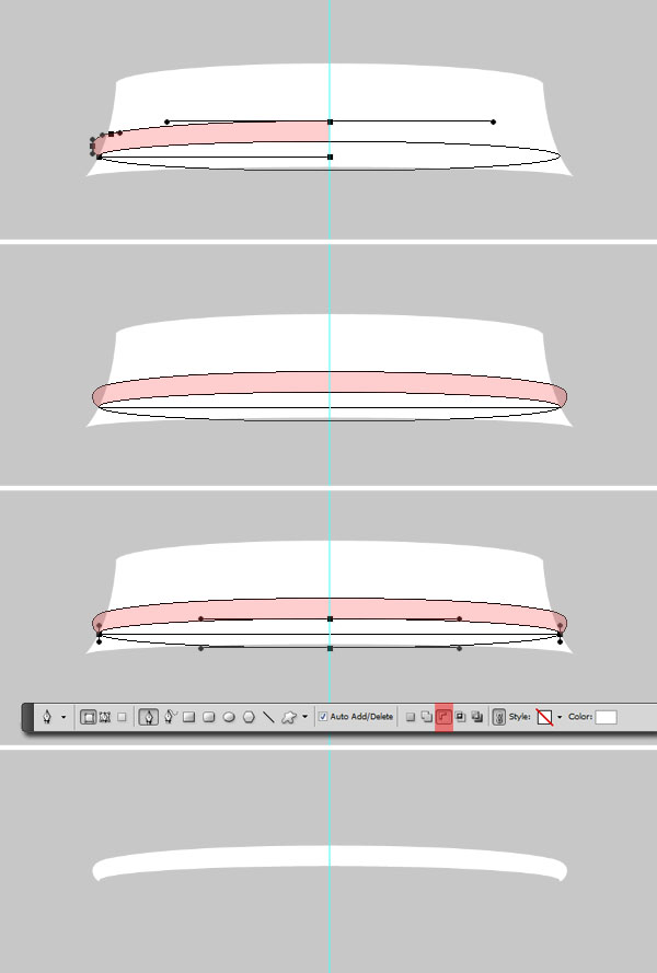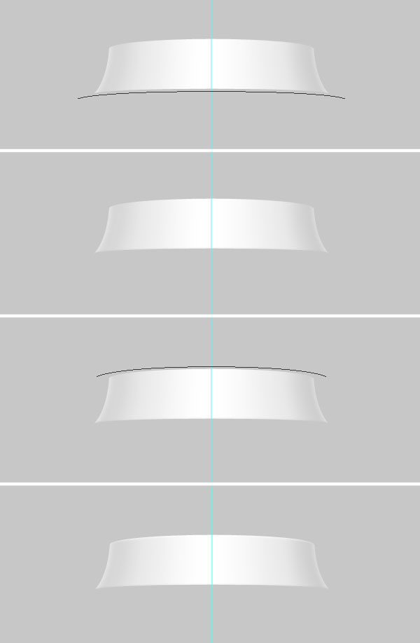 یک مسیر با ابزار Pen درست کنید که از انحنا پایین حلقه کلاهک پیروی کند. مسیر را در انتهای قسمتهای پایینی کمی منحرف کنید. یک لایه جدید ایجاد کرده و نام آن را bottom_shadow بگذارید. لایه جدید را انتخاب کرده و مسیر را با یک Brush مشکی، نرم بزرگ Stroke کنید. یک لایه دیگر اضافه کنید و نام آن را bottom_shadow_2 بگذارید و مسیر را با یک Brush کوچکتر Stroke کنید و Opacity هر 2 لایه را به 10% کاهش دهید. حالا یک حلقه کلاهک clipping mask شده وجود دارد.