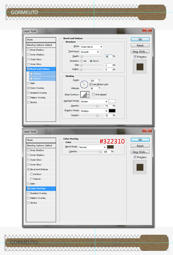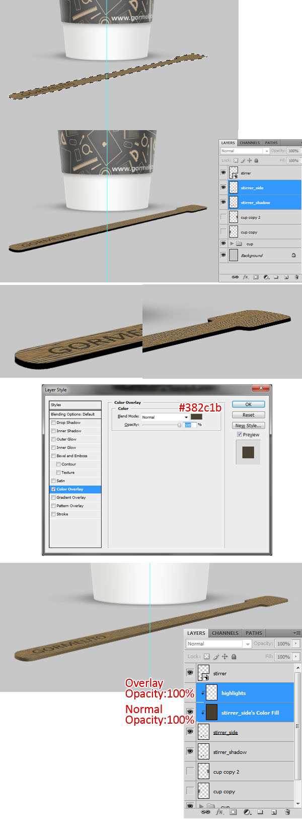 لایه stirre_side راانتخاب کرده و با یک brush مشکی با hardness 100%. انتهای حذف شده را رنگ کنید تا کنارها به قاشق متصل گردد. بر روی لایه دبل کلیک نماید در properties و color overlayرا ایجاد کنید. بر effect لایه راست کلیک کرده و creat layers را انتخاب کنید.