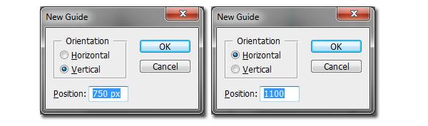 با تنظیم چند خط راهنما شروع میکنیم یکی در وسط محور عمودی در 750px ویکی در وسط محور افقی در 1100px.