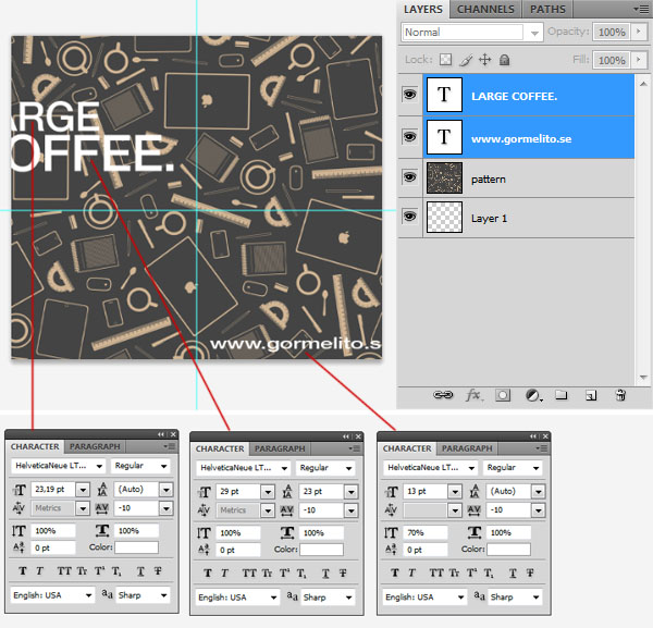 الان تمام قسمتهای لازم برای فنجان قهوه درست شده است حالا شما میتوانید مقیاس ها را درست کنید، آن فنجان قهوه حدودا 1100pxارتقاع و 650px عرض دارد.مطمئن شوید لایهای شما به همان ترکیبی که دیده میشود قرار دارد.