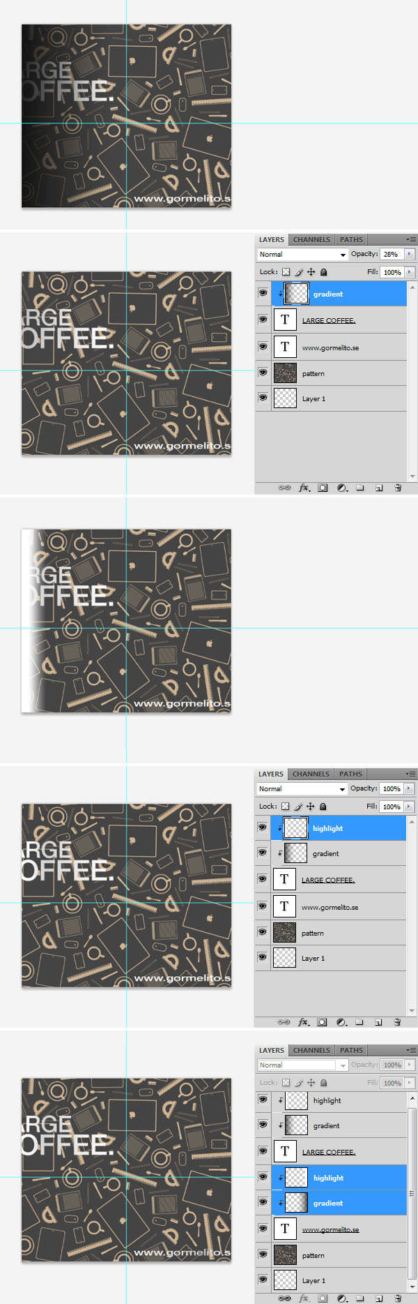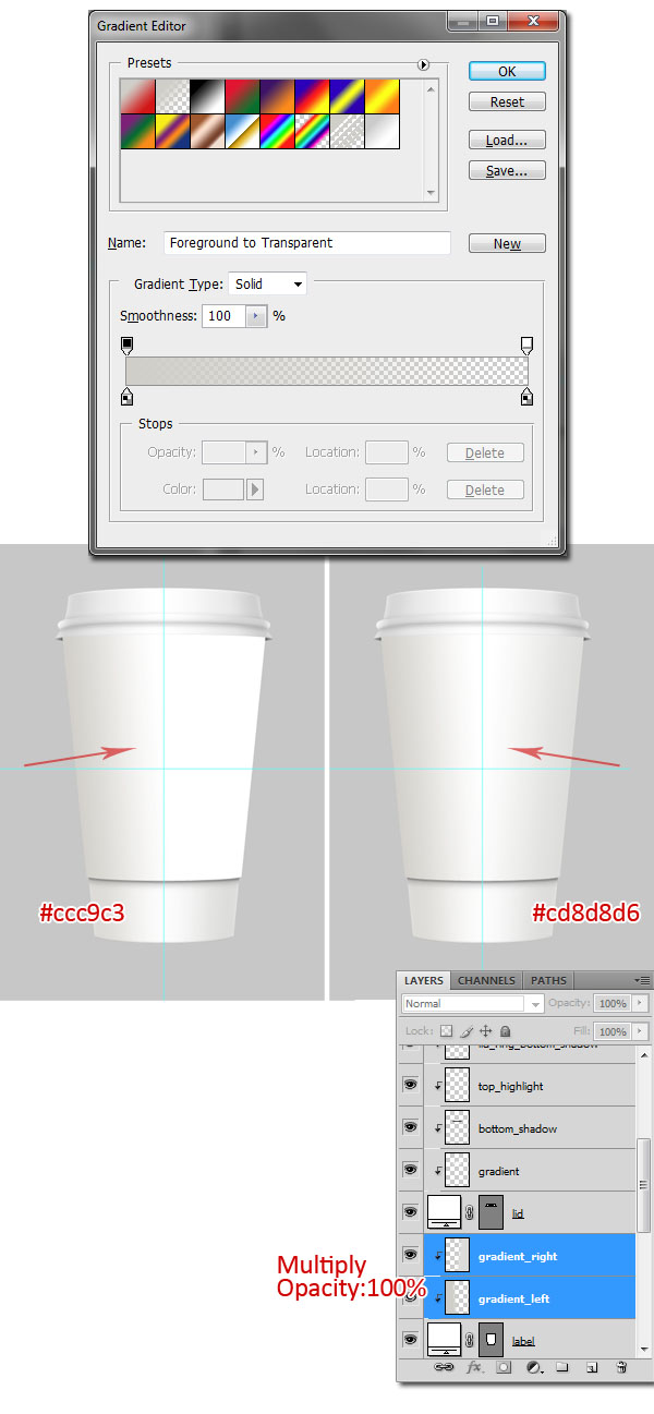 دولایه جدید بر روی لایه برچسب درست کرده و نام آنها را gradient_left و gradient_rightقرار دهید. این دولایه را تحت clipping mask برچسب قرار دهید. با ابزار gradient انتخاب شده gradient ها راهمانند انچه در تصویر نشان داده تنشیم کنید. حالت blending هر دو را روی multyplay قرار دهید.