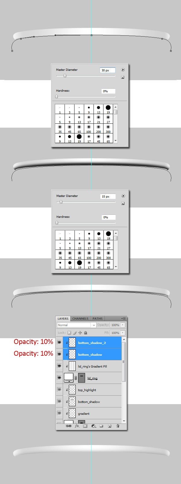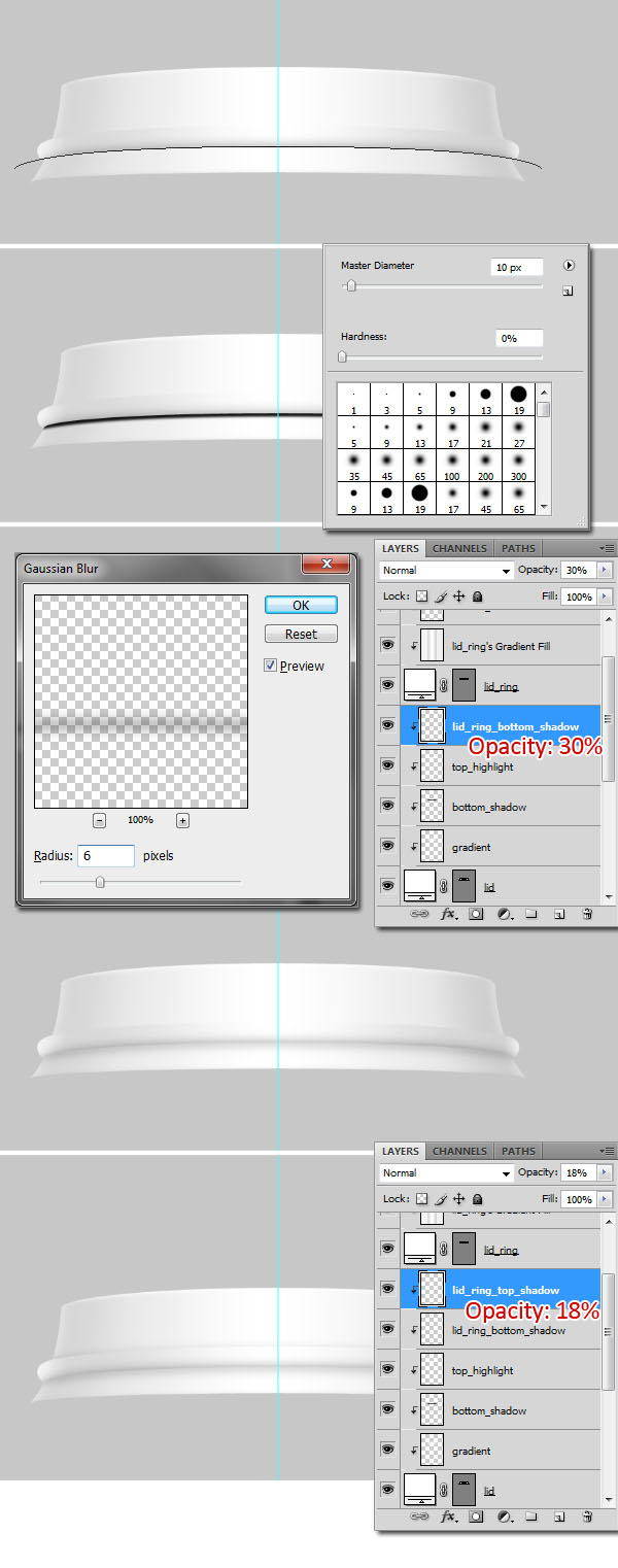 یک path که از حلقه پایینی کلاهک پیروی میکند ایجاد کنید . یک لایه جدید بر روی top_highlight برای کلاهک درست کنید ونام آن را lid_ring_bottom_shadow بگذارید. Path را بایک براش مشکی stroke کنید. فیلتر Filter > Blur > Gaussian blur را انتخاب نمایید واندازه آن را روی 6px تنظیم نمایید.opacity را به 30% تغییر نمایید. یک کپی از لایه بگیرید ونام آن را lid_ring_top_shadow گذاشته وبه بالا منتق کنید.