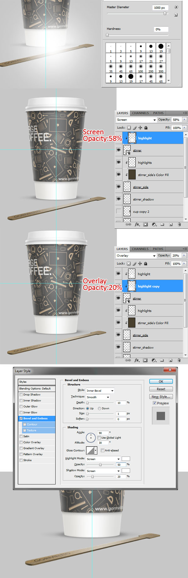 لایه highlights را انتخاب و bevel and emboss را بسازید در بالای لایه stirrer smart object و تنظیمات shadow را تغییر دهید مطابق تصویر.