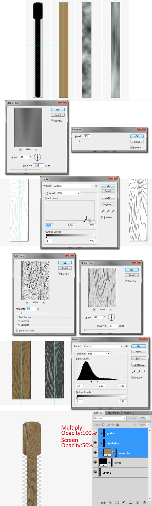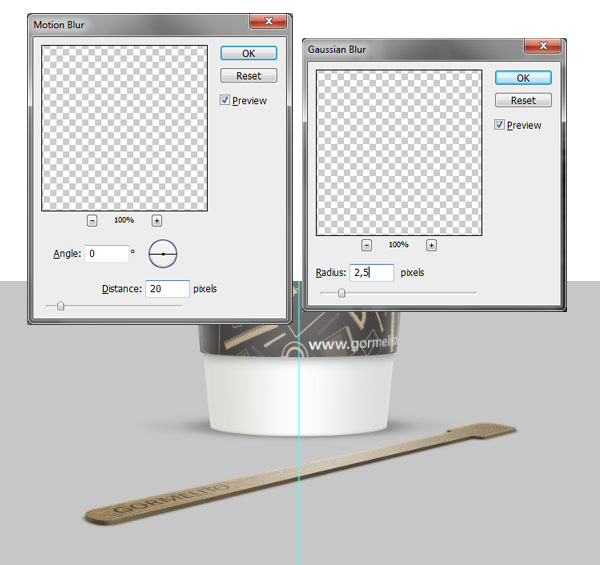 لایه stirrer_shadow را انتخاب کنید و فیلتر Motion blur و Gaussian blurرا مطابق زیر اعمال کنید.