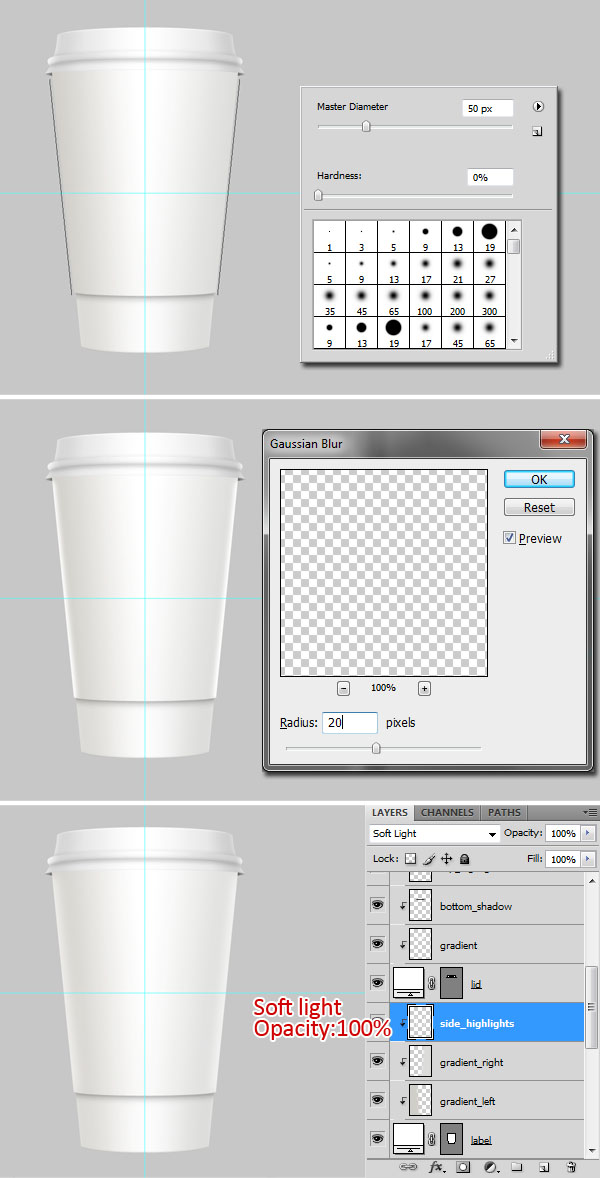 برای آنکه فنجان بیشر احساس " round " دهد، مقداری نور بیشتر بر روی برچسب ایجاد کنید.مسیرهایی را در اطراف برچسب ایجا نمایید و لایه جدید را در بالای لایه gradient قرار دهید و آن را clipping mask برچسب نمایید ونام آن را side_highlights بگذارید. مسیر را با یک براش نرم stroke نمایید و حالت blending آن را روی Soft Light قرار دهید.