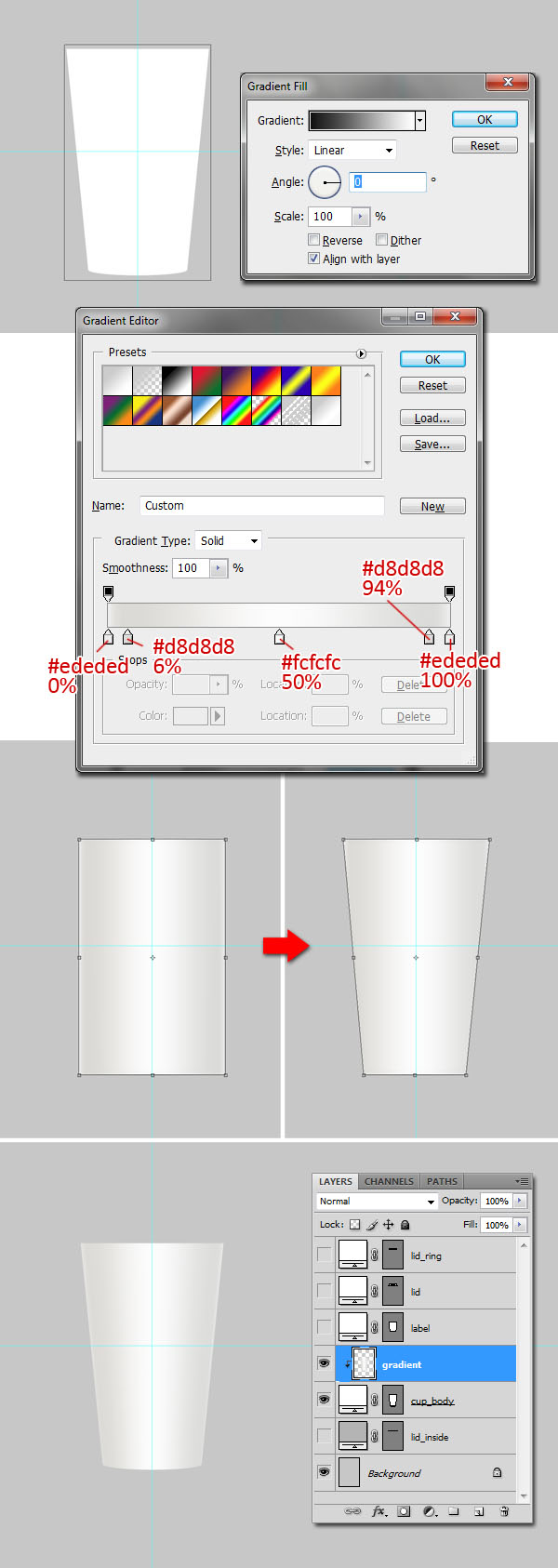 الان زمان آن است که قسمت ها به زندگی برگردند، ما با فنجان شروع میکنیم. یک شی کمی بزرگتر از فنجان درست کنید. یک gradient fill همان طور که درپایین نمایش داده شده است درست کنید.یک لایه جدید در بالای gradient fill بگذارید. gradient fill ولایه جدید را انتخاب و Cmd/Ctrl + E رابه منظور ترکیب فشار دهید.