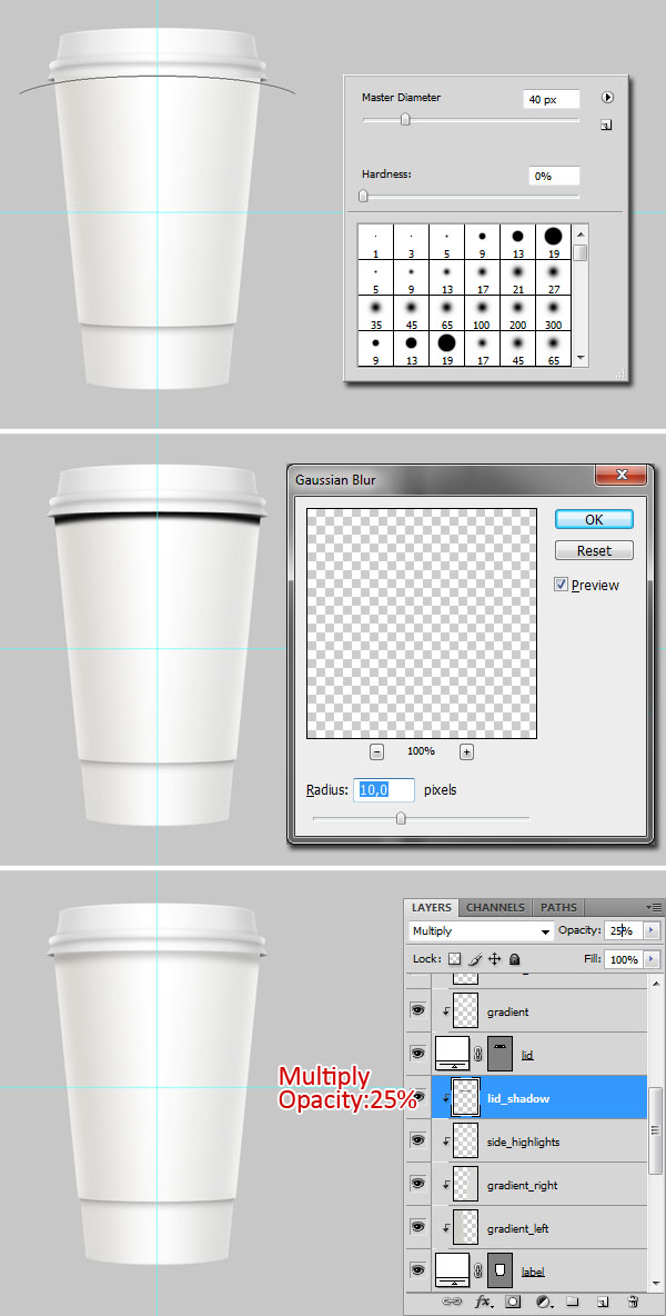 مسیر را با براش مشی stroke کنید.یک کپی از لایه بگیرید و نام آن را به label_bottom_shadow_2 بگذارید. و opacity آن را 10% تنظیم کنید. اولین لایه را انتخاب کرده و به label_bottom_shadow رفته و یکه bur 20px ایجاد نمایید و opacity را 40% قرار دهید.مطمئن شوید هر دولایه تحت clipping mask فنجان باشند.