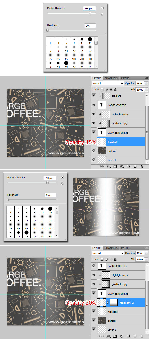 یک لایه جدید روی لایه pattern ایجاد کنید و آن را highlight نام گذاری کنید. یک brush stroke در میان خط وسط با یک brush نرم سفید بزرگ بسازید. Opacity لایه را روی 15% قرار دهید از لایه نسخه برداری کنید و یک لایه mask ایجاد نمایید. لایهmask را انتخاب کرده و یک gradient سیاه از پایین تا وسط ایجاد نمایید. بنابراین قسمت پایین لایه به سمت پایین محو میشود از opacity بالا تا صفر در پایین.opacity لایه را به 20% تغییر دهید. لایه label_print را ذخیره کنید و ببنید. Lable تمام شده است.