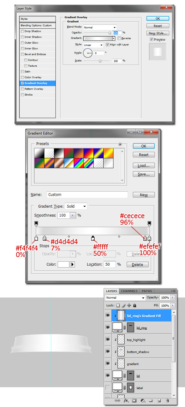 بر روی لایه lid_ring دابل کلیک کرده و gradient overlay را همانطور که نشاه داده شده انتخاب کنید و Ok را فشار دهید. سپس بر روی لایه راست کلیک کرده و create layers را انتخاب کنید. نتیجه این کار، ایجاد یک لایه جدید بر روی لایه lid_ring است. نام آن را lid_ring’s Gradient Fill بگذارید.