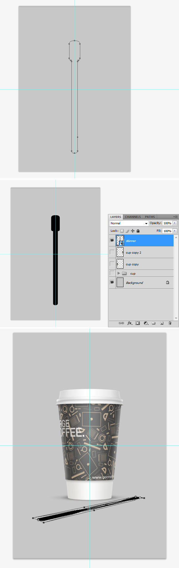 برای اضافه کرن برخی جزئیات به تصویر یک قاشق چای خوری خواهیم ساخت. از تکنیک مشابه که برای فنجان استفاده کردیم باری ساخت قاشق استفاده میکنیم. لایه را رنگ کنید و آن را stirrer بنامید بر روی لایه راست کلیک نمایید و گزینه Convert to Smart Object را انتخاب کنید. حال نوبت آن است که آن را در مکانی قرار دهیم. یه نظر میرسد آن را درکنار فنجان بزرگ قرار دهید.