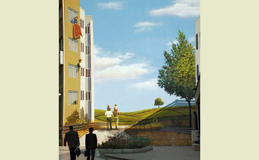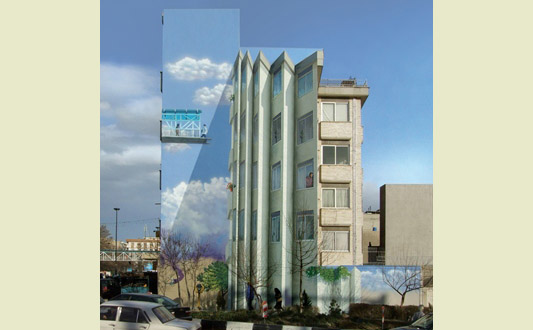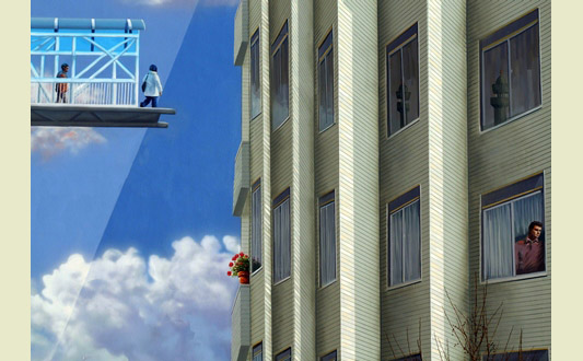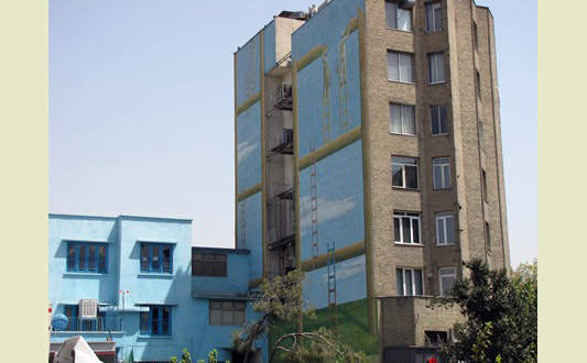 نردبانی روبه آسمان، لوکوموتیوی که بر روی نردبانی در حال حرکت است و نوجوانی که از انتهای قطار آویزان است همگی فضایی فرا واقعگرایانه خلق نموده اندکه در عین حال با توجه به فضای قرارگیری و تاکید بر سایه درختان اطراف، این اثر را با دنیای واقعی پیوند داده است. این نقاشی دیواری، بدون حضور المان های کلیشه ای شرقی و ایرانی، واقعاً ایرانی هستند و مخاطب با آنها احساس نزدیکی می کند.