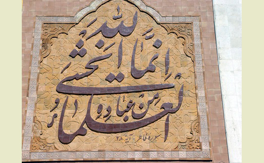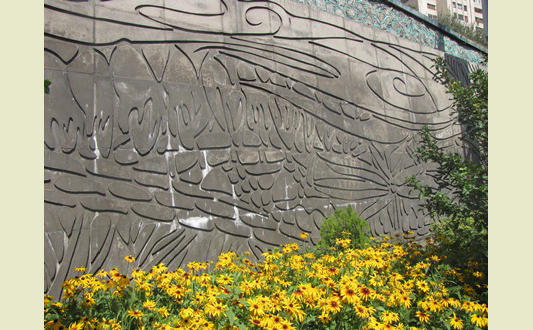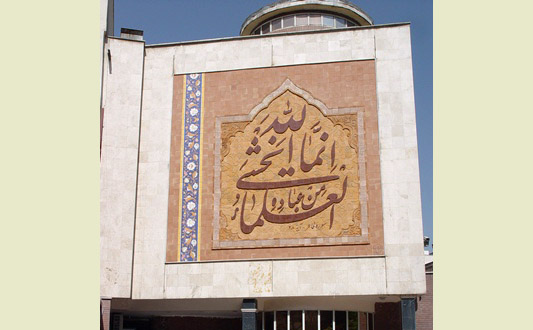 تلفیق نقوش تزئینی ایرانی- اسلامی و خط نستعلیق طرحی گرافیکی را خلق نموده است که با استفاده از تکنیک نقش برجسته سفالی و رنگ خاص خود موجب همگونی بیشتر با معماری ایران گردیده است. متن ذکر شده در این اثر آیه 28 سوره فاطر:«انما یخشی الله من عباده العلما» به معنای «از بندگان خدا تنها اهل معرفت از او خشیت دارند» می باشد.